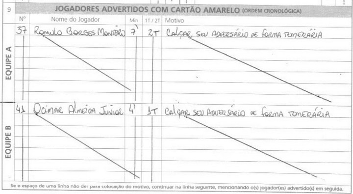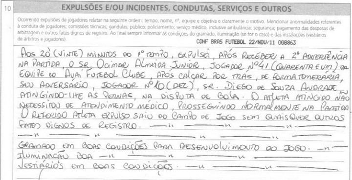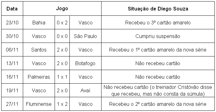 Só que a súmula oficial da partida Vasco 2 x 0 Avaí (veja trechos abaixo) não registra tal cartão. O documento só informa um cartão amarelo para vascaíno: Romulo, aos 7 minutos do 2º tempo. O nome de Diego Souza até aparece no relato do árbitro, mas somente como tendo sido o atleta que recebeu a falta que originou a expulsão do jogador Júnior Urso, do Avaí.