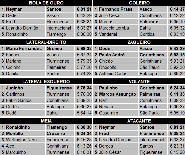 Com a média de 6,81, o santista Neymar é o melhor jogador do Brasileirão desde Edílson no Brasileirão de 1998. Dedé e Fred disputam a segunda posição.