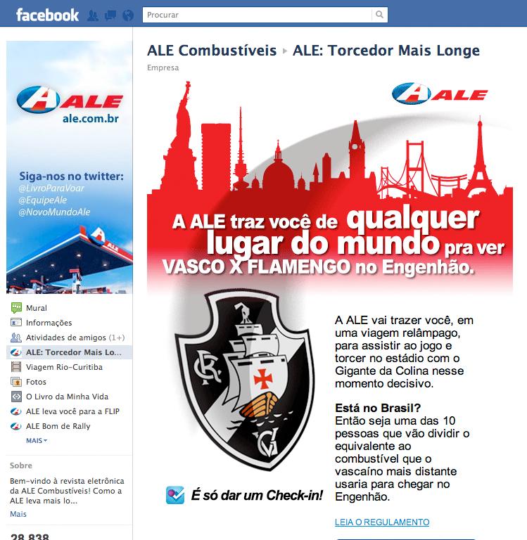 “Check in no Brasil”: Se estiver em território nacional, o participante terá que ir até um dos postos da rede ALE e fazer o “Check in no Brasil”, também pelo Foursquare, no aplicativo na Fan Page da ação, no Facebook. Além disso, ele terá que responder criativamente à frase “Por que eu mereço o equivalente em combustível ao que o vascaíno mais distante usaria para chegar no Engenhão?”. Os autores das 10 melhores frases vão dividir entre eles a quantidade de combustível que o torcedor mais distante do mundo gastaria se fosse possível ir de carro até o estádio. Por exemplo, se o ganhador do exterior estiver no Japão, serão divididos 1850 litros de gasolina entre os 10 vencedores do Check in no Brasil. Os interessados têm até a próxima sexta-feira (dia 2/12) para dar Check in nos postos ALE e enviar sua frase criativa.
