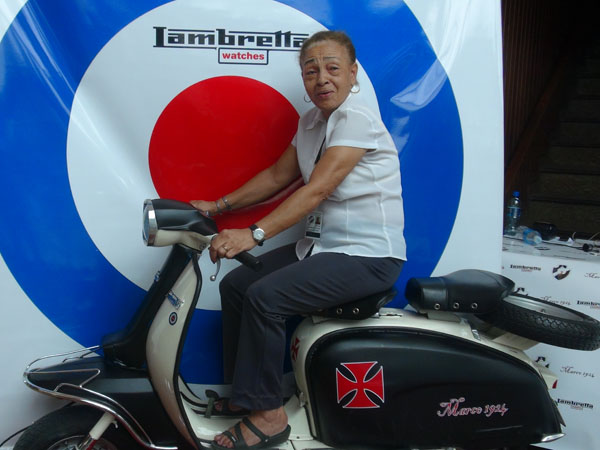 No final da entrega dos relógios, a funcionária do clube e guardiã da Sala de Troféus, Angelina, aproveitou para posar na Lambreta que estava estacionada na entrada da social.