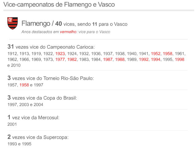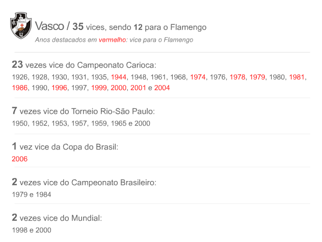 No confronto direto, no entanto, a vantagem é do Flamengo. O time já foi 12 vezes campeão com o rival como vice. O Vasco já comemorou 11 vezes com o Flamengo em segundo.