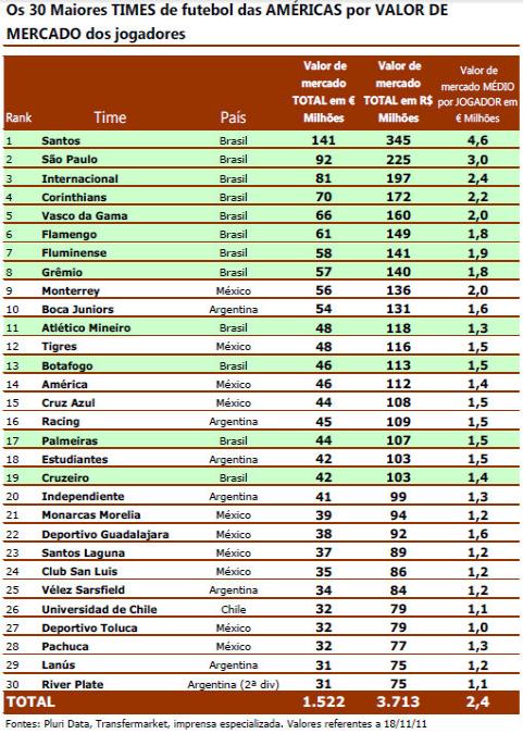 O valor dos elencos desses 30 times é de 1,5 bilhão de euros, equivalente a 3,7 bilhões de reais, e os três times mais valiosos – Santos, São Paulo e Internacional – representam, somados, 21% do valor de mercado de todos os 30 times. Os doze times brasileiros, 40% do total de times, valem, considerando os dados desse estudo, 807 milhões de euros, ou seja, 53% do valor total dos 30 times.