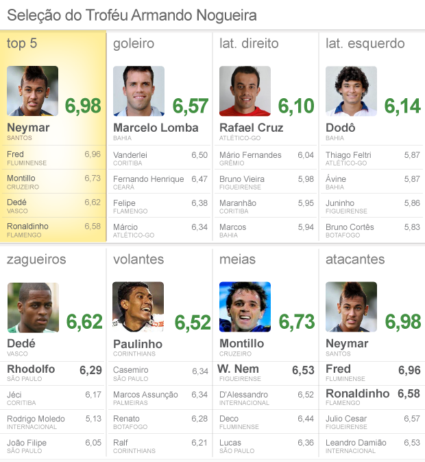 Principal joia do futebol brasileiro na atualidade, Neymar impressiona pela criatividade que tem com a bola nos pés. A partir desta arte, o moicano tem conquistado fãs, títulos e prêmios, apesar da pouca idade, apenas 19 anos. Com uma média de 6,98, o jogador do Santos faturou o Troféu Armando Nogueira de 2011, ficando apenas dois décimos à frente do atacante Fred, do Fluminense, que fez um segundo turno de Campeonato Brasileiro espetacular.