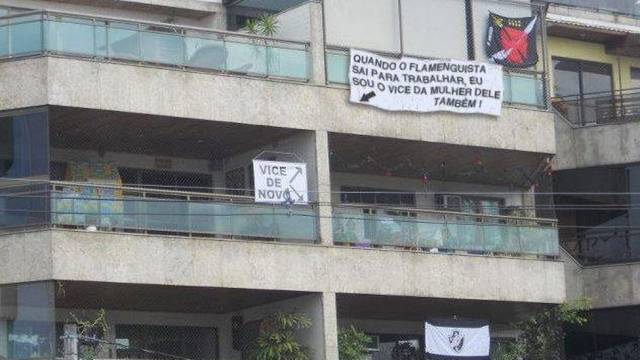 “Quando o flamenguista sai para trabalhar eu sou o vice da mulher dele também”, escreveu em um cartaz com a seta para a janela do vizinho.
