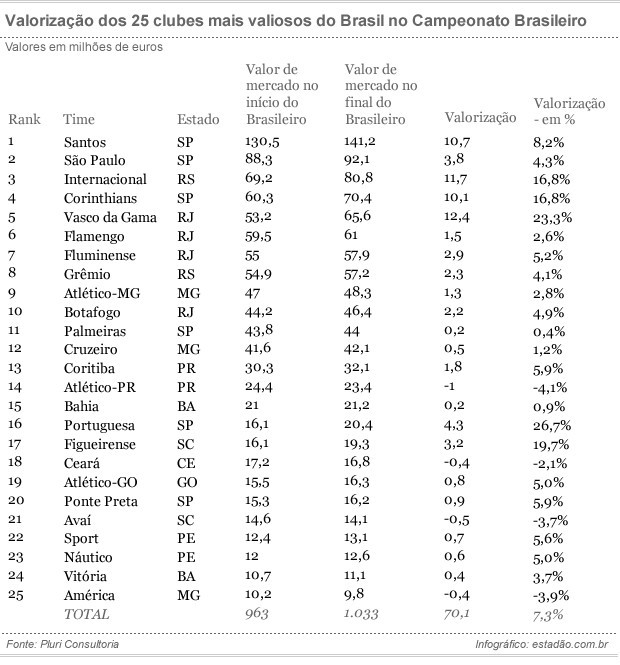 A empresa Pluriconsultoria divulgou nesta quarta-feira uma pesquisa para mostrar os 25 times que mais se valorizaram no futebol brasileiro em 2011. Os destaques foram o Vasco e a Portuguesa, que fizeram grandes campanhas na temporada. O Santos é o time mais valioso do País.