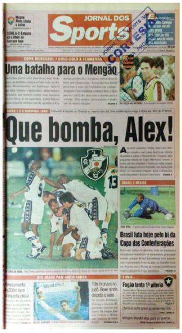 Alex Oliveira substituiu Viola, entrou em campo vaiado e saiu como herói na vitória dramática sobre o Nacional do Uruguai, pela 2a rodada da Copa Mercosul, ontem à noite, em São Januário. O Vasco só volta a jogar dia 28, contra o Cerro Porteño, em Assunção. Hoje, os vascaínos viajam para a Espanha, onde disputam o Ramom Carranza. O Vasco não jogou bem. O golaço de Alex Oliveira, aos 44 do 2o tempo, evitou mais um tropeço e garantiu a vitória de 1 a 0 sobre o Nacional, do Uruguai, ontem, em São Januário. Que o empate com Sport e a derrota para o Peñarol fizeram uma forte pressão desabar sobre São Januário ficou claro desde o início do primeiro tempo. Nervoso, o time do Vasco errava passes e não conseguia passar perto do gol. O Jornal dos Sports publicou matéria no dia 4 de agosto de 1999.