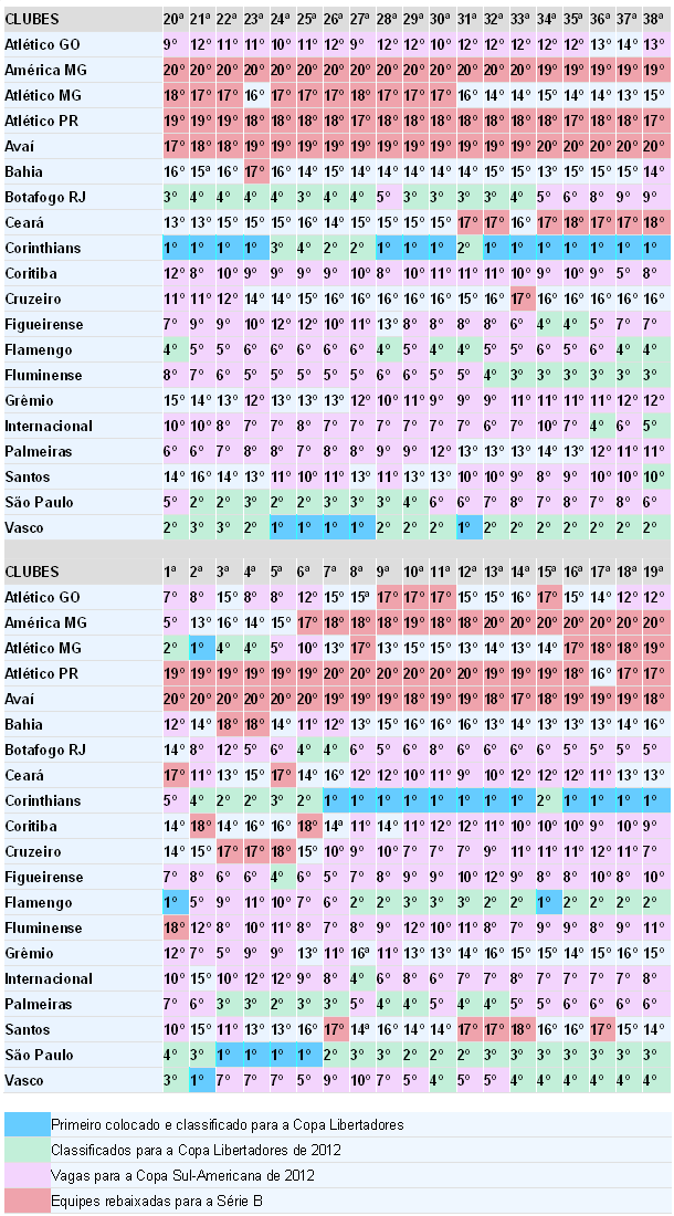 Foram 6 rodadas na liderança, 12 na vice-liderança, 3 na 3ª colocação, 7 em 4º lugar (perfazendo um total de 28 em 38 na zona da Libertadores), 4 em 5º lugar, 4 na 7ª colocação, uma em 9º lugar e uma no 10º posto. Confira a colocação do Vasco e dos outros clubes rodada a rodada do Brasileirão 2011: