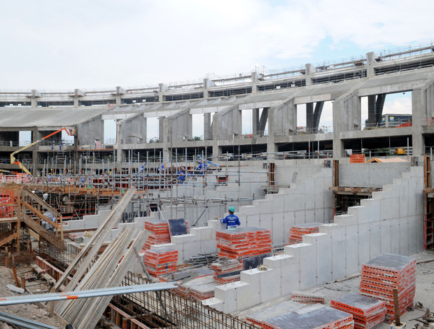 A parte inferior da nova arquibancada do Maracanã, que está sendo reformado para a realização da Copa do Mundo de 2014, começou a ganhar forma nesta semana. Os operários iniciaram o processo de concretagem para colocar os blocos que servirão de base para as cadeiras numeradas. No projeto de modernização, elas vão do gramado até o topo do antigo anel superior, sem separação de setores. O estádio passará a ter assentos mais modernos - na cor vermelha - em toda sua extensão e eles terão sua distância do campo reduzida: serão só 12 metros.