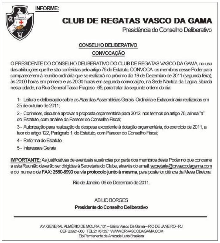 27/10 Conselho Deliberativo aprova as contas de 2009 e 2010 do Vasco
