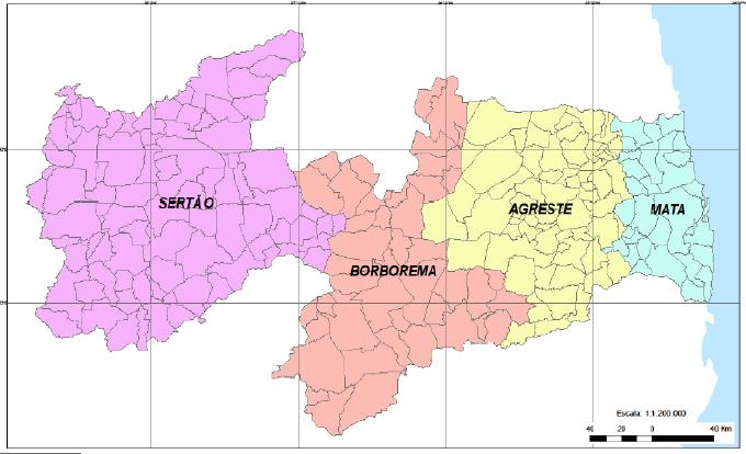 Em primeiro lugar, o estado da Paraíba foi subdividido em quatro regiões (Mata, Agreste, Borborema e Sertão), conforme gráfico abaixo: