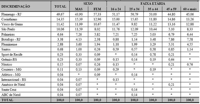 Mas a estabilidade na preferência intertemporal não significa que isto permanecerá indefinidamente, pois existe claro processo de crescimento das torcidas paulistas entre os mais jovens. Em meio àqueles entre 16 e 24 anos, o Corinthians sobe para 15% e o Sao Paulo ultrapassa o Vasco (11,76% a 11,47%). Dramática mesmo é a situação de Botafogo e Fluminense. O alvinegro – que entre os mais velhos sobrepõe a barreira dos 7% – desaba a 0,88% em meio aos jovens. Os tricolores também caem muito, de 4,55% a 1,18%. A exceção que confirma a regra é o Flamengo, único carioca que cresce quando confrontamos velhos e novos. E não cresce pouco: seis pontos percentuais (51,17% entre as novas gerações).