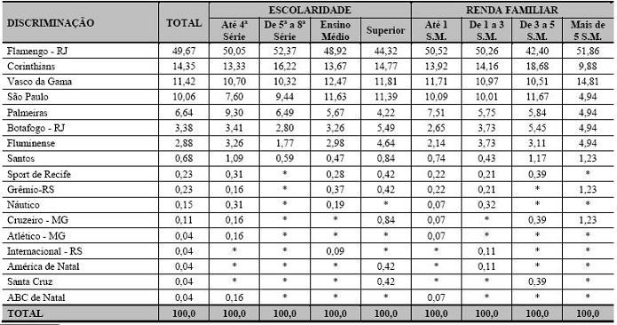 Em termos de escolaridade, apenas Flamengo e Palmeiras diminuem conforme se avança nos anos de estudo. Todos os demais – Corinthians, Vasco, São Paulo, Fluminense e Botafogo – possuem mais torcedores entre aqueles que completaram o ensino superior. Já no tocante à renda, quanto mais ricos, mais torcedores do Rio. De fato, os paulistas desabam entre os que recebem acima de 5 salários mínimos. Uma explicação seria o fato de que são torcidas jovens, com pessoas ainda em início de carreira. De todo modo, o poder aquisitivo dos torcedores cariocas destoa, a ponto de Botafogo e Fluminense alcançarem São Paulo e Palmeiras: todos com 4,94% na maior faixa de renda.