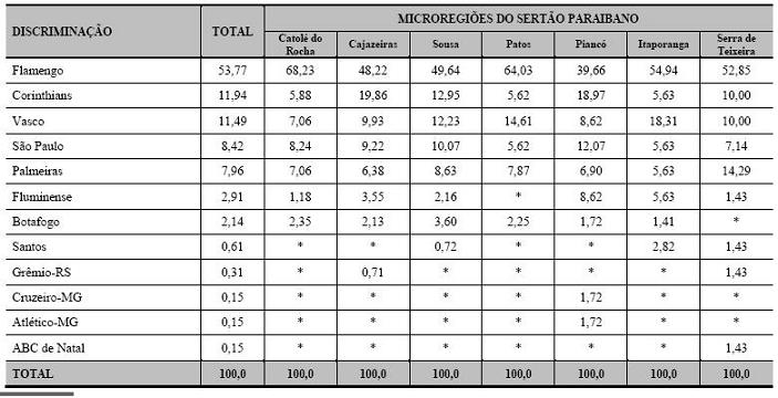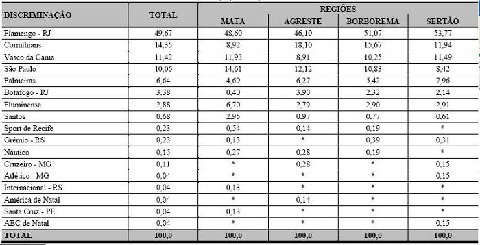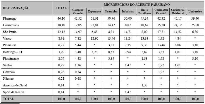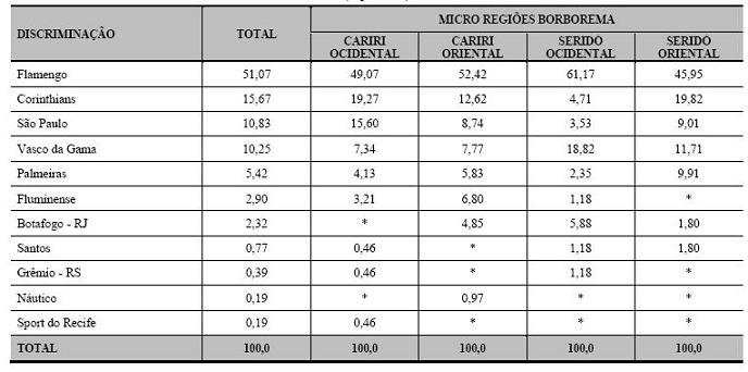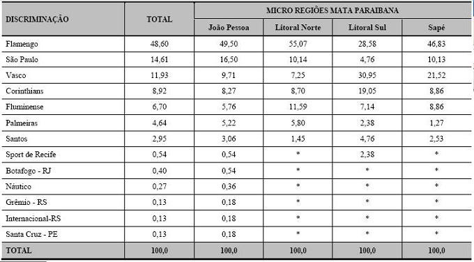 Não existem grandes surpresas nesta região, com o Flamengo liderando em todas, seguido quase sempre por Corinthians, São Paulo e Vasco. Mas a pequena cidade de Curimatú Oriental apresentou apenas 1,92% de vascaínos – mesmo número de cruzeirenses! Já Guarabira foi onde se verificou o maior número de botafoguenses em toda a pesquisa: 8,65%.