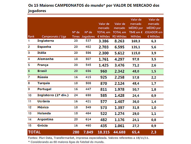 Além dos números fechados, a empresa também fez um levantamento de valor médio de mercado por time e por jogador. Por equipe, o Brasileirão aparece na nona posição, com 48 milhões de euros (cerca de R$ 116,6 milhões), sendo superado pelos campeonatos russo, português e turco. Por jogador, o valor de mercado brasileiro é de 1,5 milhões de euros (R$ 3,6 milhões), ficando também na nona colocação do ranking, atrás dos mesmos países.