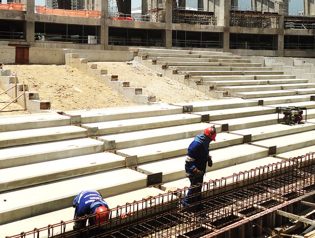 As 2.748 peças de concreto armado que vão compor a nova arquibancada do Maracanã já começaram a ser instaladas no estádio. As estruturas são estocadas no centro do campo e, depois, colocadas com o auxilio de quatro gruas. Na última semana, as primeiras foram usadas na parte conhecida como o contraforte, que fica a 14 metros da linha lateral de jogo. A previsão de término dessa fase da obra é setembro de 2012, antes da operação de içamento da nova cobertura. A arquibancada atende todas as recomendações da Fifa para a Copa do Mundo 2014.
