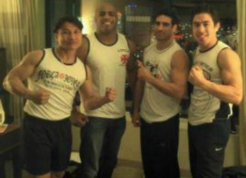 Equipe do norte-americano Chad Mendes posa para foto com camisas de uma torcida organizada do Vasco da Gama. O treinador de jiu-jitsu de Mendes já havia declaro, em entrevista ao LANCENET!, ter recebido materiais desta mesma torcida. Chad será o próximo desafiante ao cinturão dos peso penas do UFC, no qual enfrentará o brasileiro e campeão da categoria José Aldo.