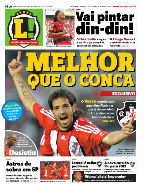 Ainda na busca por jogadores sul-americanos para a próxima temporada, o Vasco estuda a contratação do meia argentino Matías Abelairas, de 26 anos, que, apesar de desconhecido no Brasil, já colocou até Darío Conca no banco de reservas nos tempos de River Plate (ARG). O jogador foi oferecido recentemente e agradou aos dirigentes cruzmaltinos.