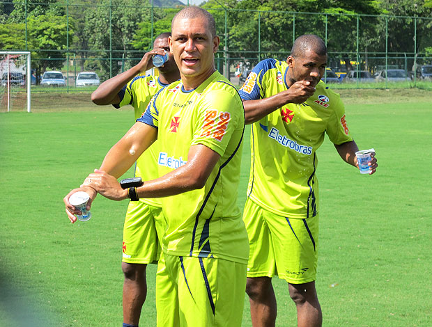 Eduardo Costa, Renato Silva e Kim procuram se hidratar durante treino do Vasco pela manhã