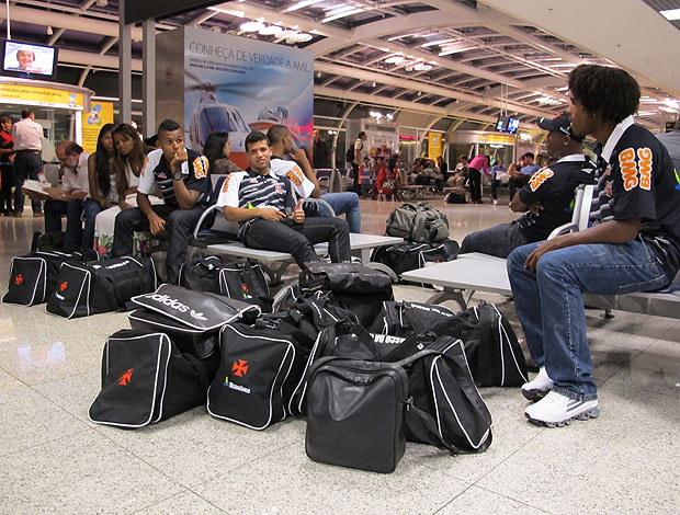 Com suas bolsas, jogadores do Vasco esperam para embarcar no Aeroporto Santos Dumont