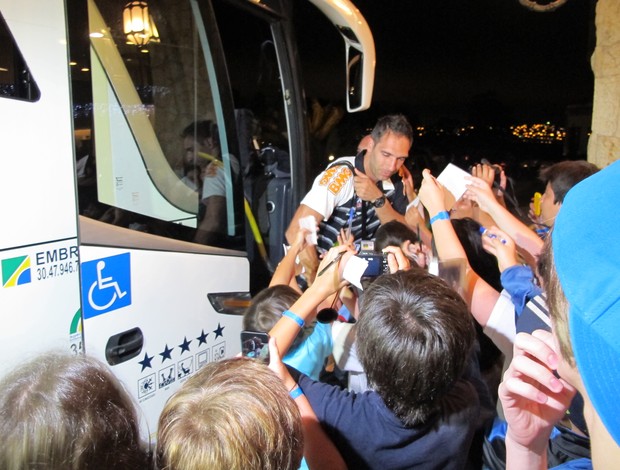 Logo que desceram do ônibus em direção à recepção do hotel, os jogadores foram cercados pelas crianças. Muitos com camisa do Vasco e outros até com uniformes de Palmeiras e Corinthians foram à caça de autógrafos. Os principais alvos foram Dedé, Diego Souza e Fernando Prass.