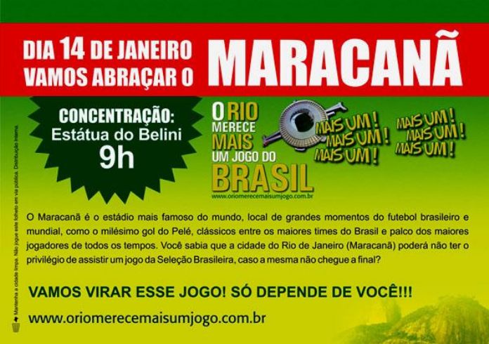 Um grupo de torcedores carioca lançou recentemente uma campanha pela internet para tentar convencer a Fifa a mudar a tabela da Copa do Mundo de 2014 e garantir pelo menos uma partida da Seleção no Maracanã: “O Rio merece mais um jogo do Brasil”.