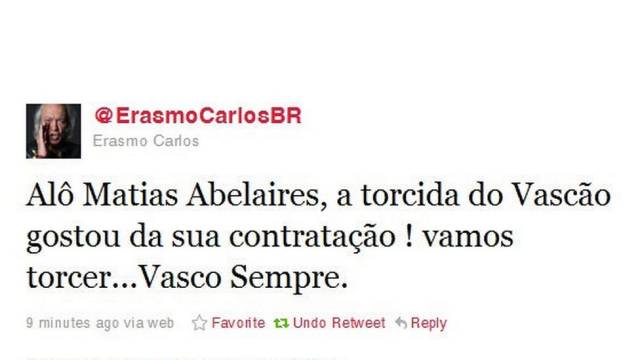Quem diria que o desconhecido argentino Matías Abelarias ganharia um apoio de um torcedor ilustre vascaíno. Pelo Twitter, o cantor e compositor Erasmo Carlos, o Tremendão, deu seu voto de confiança ao jogador, que está há seis meses sem jogar profissionalmente. O único problema é que o Tremendão escreveu o nome do argentino errado.
