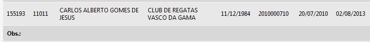 O sócio Benfeitor Remido do Vasco, levado a esta condição por Roberto Dinamite, está apto a estrear no Campeonato Estadual de 2012 pelo Vasco. Confira no Boletim Informativo de Registro de Atletas (BIRA) da Federação, número: 155193.
