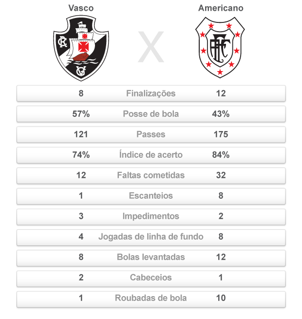 O time esteve abaixo do normal também no quesito finalizações: foram oito no jogo, contra 12 do Americano. Nos escanteios, a equipe de Campos também foi bem superior: oito, contra um do Vasco. Como levou a melhor no quesito mais importante (gols), o Cruz-Maltino levou três pontos para casa após a primeira rodada.