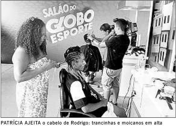 Fato é que, por mais esquisitos que sejam, os estilos capilares dos craques sempre se espalham nas cabeças dos fãs do esporte bretão. Prova disso está no programa de hoje, no qual Alex Escobar foi conhecer o Salão do Globo Esporte. Montado em Padre Miguel, o estabelecimento atende os rapazes que participam da Taça das Favelas, promovida pela atração. Aldo Lessa, cabeleireiro responsável pelo corte da maioria dos jogadores do Vasco da Gama, e Patrícia Mercedes, especialista em dreads e trancinhas, fizeram a alegria dos meninos que passaram por lá. Os campeões de audiência são os moicanos, alçados ao status de favoritos por jogadores como Neymar e Léo Moura, além das trancinhas. O look de Vagner Love foi a escolha de Rodrigo, o jogador aí da foto. Teve até gente que, em homenagem à careca do apresentador, decidiu raspar a cabeça na visita ao salão.