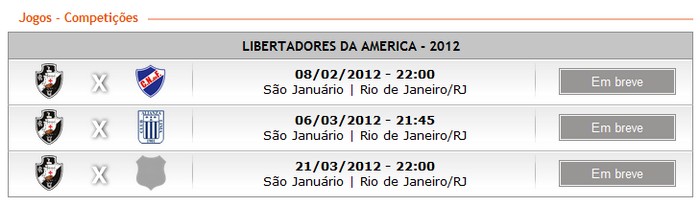 O Vasco anunciou há três horas o início das vendas de ingressos para os três primeiros jogos da Libertadores, em São Januário. Mas as vendas no site futebolcard.com continuam desativadas. Na página, a mensagem "em breve" frustra os torcedores, que já reclamam do atraso no serviço.