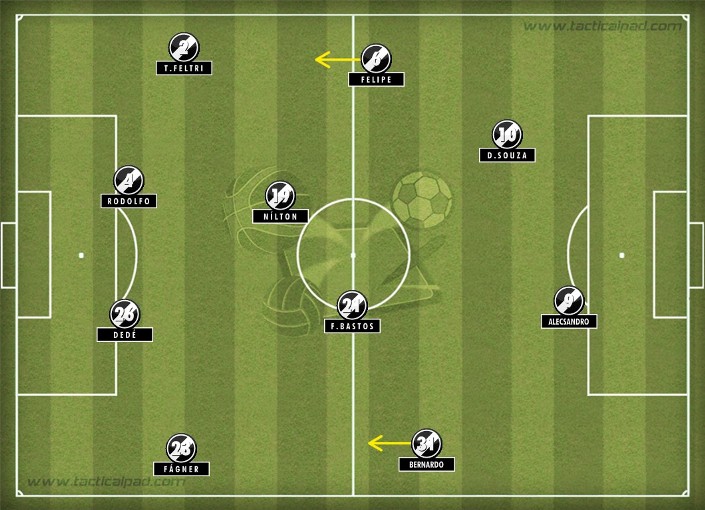 O 4-2-3-1 se desenha quando Felipe se lança mais centralizado formando o trio de meias-atacantes com Bernardo e Diego Souza. Bastos se junta a Nilton à frente da zaga e um deles fica mais fixo e auxilia os zagueiros na cobertura do lateral que apoia. Apesar de ofensivos, dificilmente Fágner e Feltri descem juntos. O lance do gol do lateral-esquerdo completando centro do direito foi uma exceção ao longo da partida. A boa notícia é que o Vasco varia mais as ações ofensivas pelos flancos, sem depender tanto do lado direito.