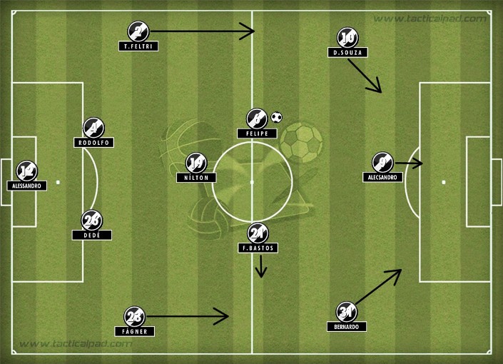 Com a bola, o 4-4-2 quase ortodoxo se desfaz. A primeira variação é uma espécie de 4-3-3. Felipe vem para o centro dividir a articulação com Bastos, que avança. Diego Souza fica espetado à esquerda e Bernardo avança praticamente como ponta-direita formando o tridente ofensivo com Alecsandro, que abriu o placar cobrando pênalti.