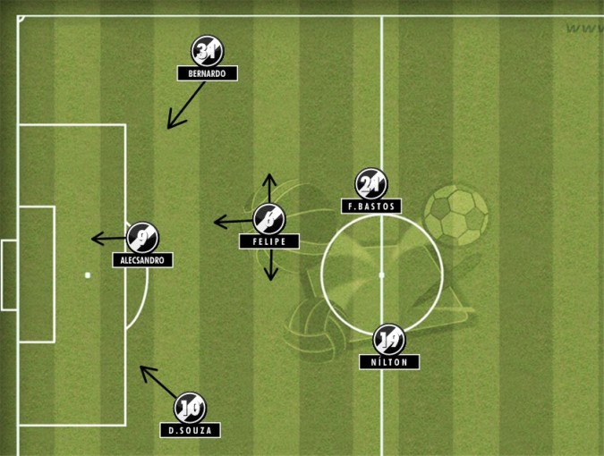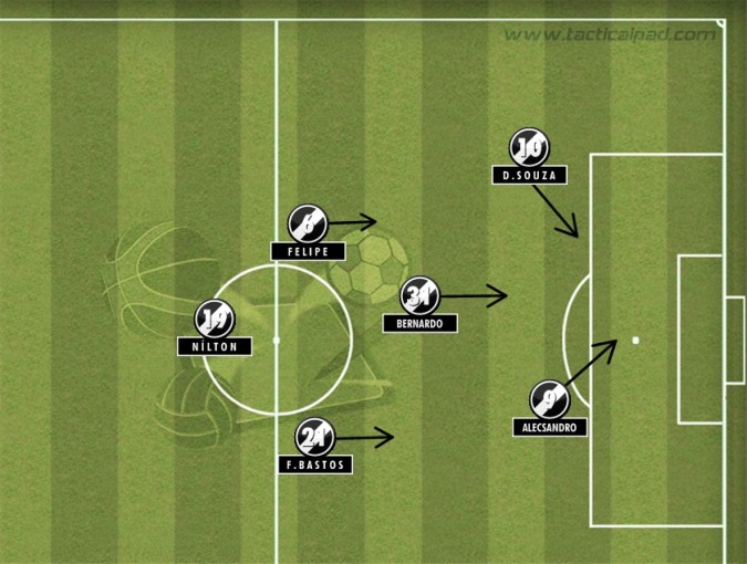Felipe centraliza e Bastos avança na articulação do meio-campo; na frente, Bernardo e Diego Souza pelas pontas buscando as diagonais na aproximação de Alecsandro.