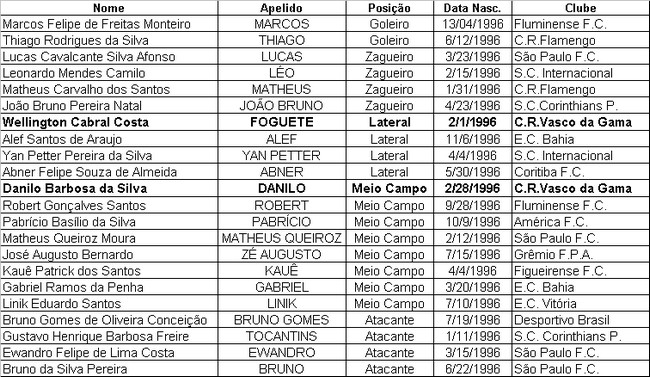 O técnico Marquinhos Santos, que em dezembro de 2011 conquistou o Sul-Americano Sub-15 do Uruguai com a Seleção, convocou nesta quarta-feira uma equipe Sub-17 do Brasil para treinamentos na Granja Comary. 22 jogadores foram chamados para este período que vai de segunda-feira, 6 de fevereiro, até o dia 16.