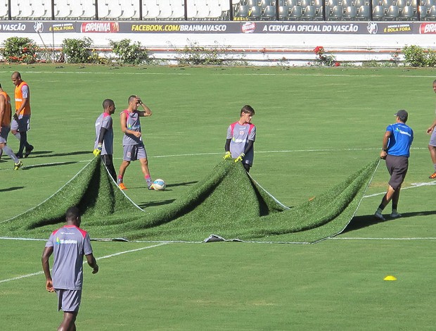 A casa é a mesma, mas o piso foi trocado. Na manhã desta sexta-feira, pela primeira vez em 2012 os jogadores treinaram com bola no novo gramado de São Januário, trocado durante os meses de dezembro e janeiro do ano passado. No último treino tático antes do jogo contra o Friburguense, a equipe não contou com Dedé, Juninho Pernambucano e Diego Souza.