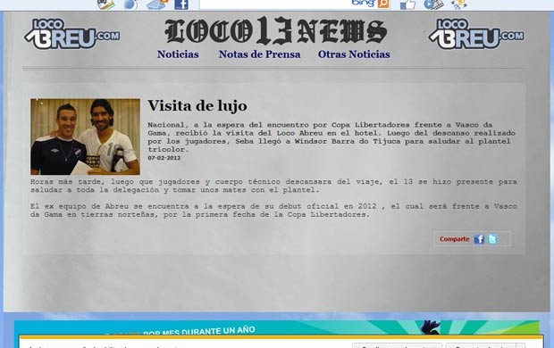 A paixão do uruguaio Loco Abreu pelo Nacional é conhecida por todos. Nesta terça-feira, em um hotel da Barra da Tijuca, o atacante do Botafogo visitou os jogadores do time, adversário do Vasco, nesta quarta-feira, em São Januário, pela primeira rodada da fase de grupos da Taça Libertadores. Em seu site oficial, ele fez questão de mostrar como foi a "Visita de luxo".
