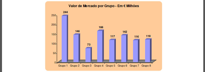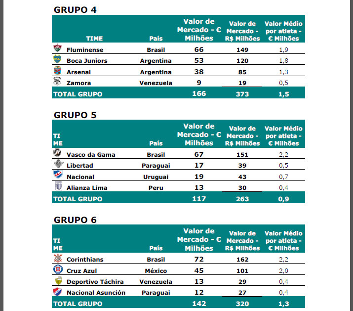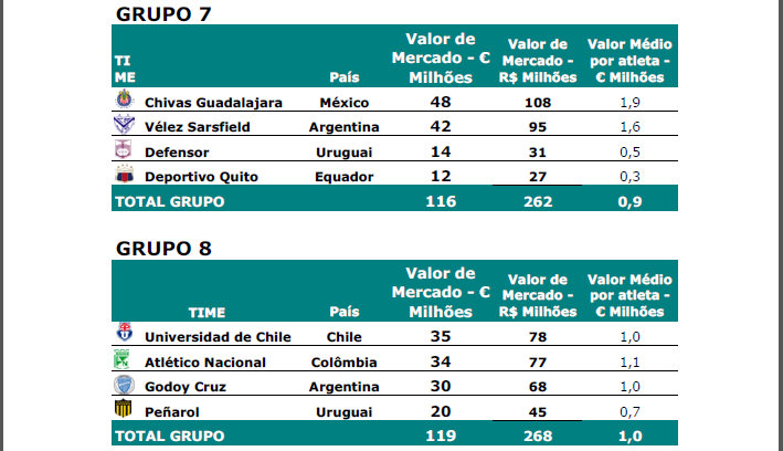 Observando os grupos, vemos que o mais valioso é o Grupo I, graças à presença dos dois times mais valiosos da competição: Santos e Internacional. A diferença de valor desses dois para os outros dois membros do grupo é muito grande: o Santos vale quase catorze vezes mais que o The Strongest e o Inter vale seis vezes e meia o Juan Aurich.