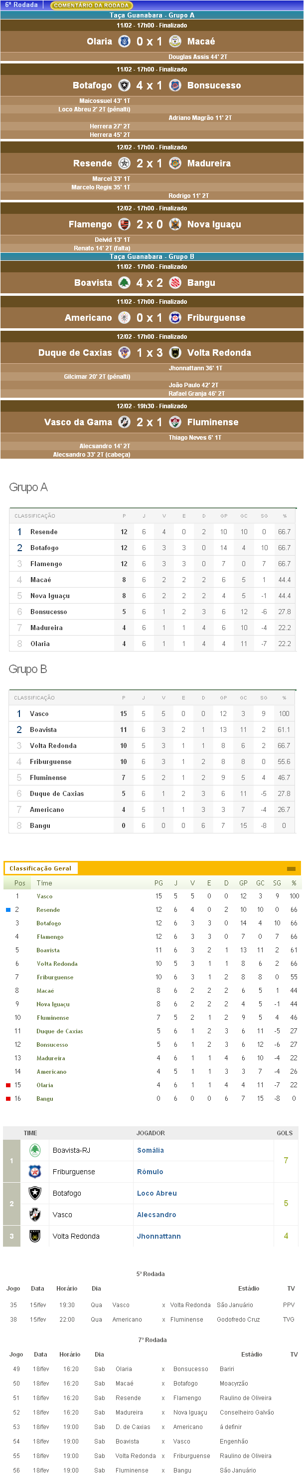 Terminada a 6ª rodada da 1ª fase da Taça Guanabara (1º turno do Campeonato Estadual), o Vasco, que derrotou o Fluminense por 2 a 1, segue na 1ª colocação do Grupo B e 4 pontos à frente do vice-líder Boavista. Com 100% de aproveitamento, o Gigante da Colina é o 1º classificado às semifinais da Taça Guanabara.
