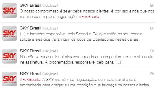 Através de seu Twitter oficial, a empresa disse: "#FoxSports: A SKY mantém as negociações com este canal e está empenhada para chegar a uma condição que favoreça os nossos clientes".