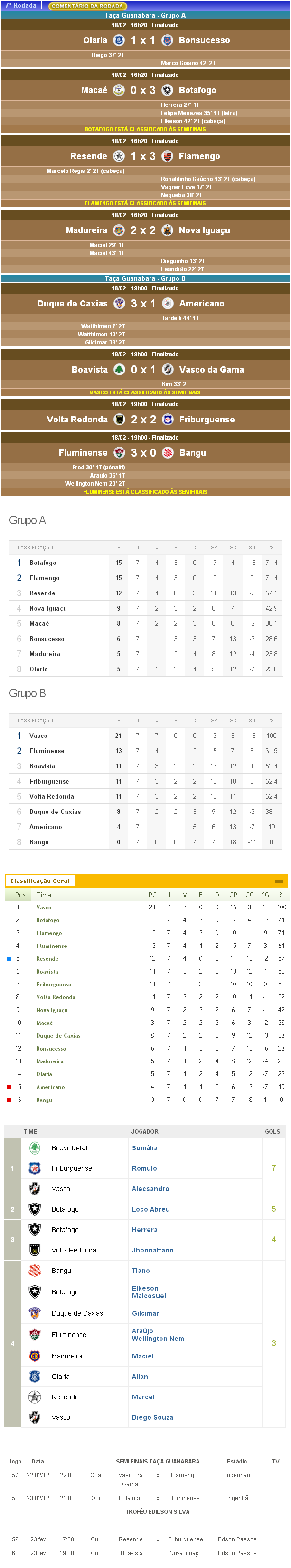 Terminada a 7ª e última rodada da 1ª fase da Taça Guanabara, que corresponde ao 1º turno do Campeonato Estadual, o Vasco, que derrotou o Boavista por 1 a 0, manteve os 100% de aproveitamento na competição e aumentou de 7 para 8 pontos sua vantagem à frente do 2º colocado do Grupo B, que acabou sendo o Fluminense.
