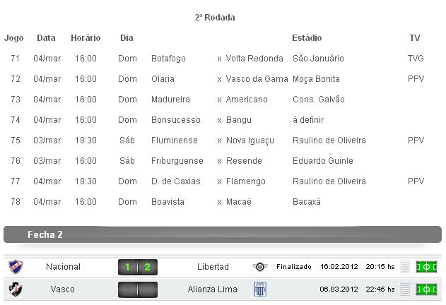 A FERJ divulgou nesta 2ª-feira (20/02) uma modificação na tabela da Taça Rio: o jogo Olaria x Vasco foi adiado de 3 para 4 de março. Desta forma, os vascaínos terão 3 dias para se recuperar do duelo contra o Bonsucesso, que está marcado para 1º de março. Só que um novo problema foi criado. Como a Conmebol marca Vasco x Alianza-PER, pela Libertadores, para 6 de março, os atletas do Gigante da Colina terão novamente um espaço curto de tempo - pouco mais de 48 horas - entre as partidas do Estadual e da Libertadores.