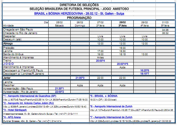 A delegação, com jogadores e integrantes da comissão técnica que moram no Brasil, viaja para a Suiça no sábado dia 25 de fevereiro dividida em dois grupos.
