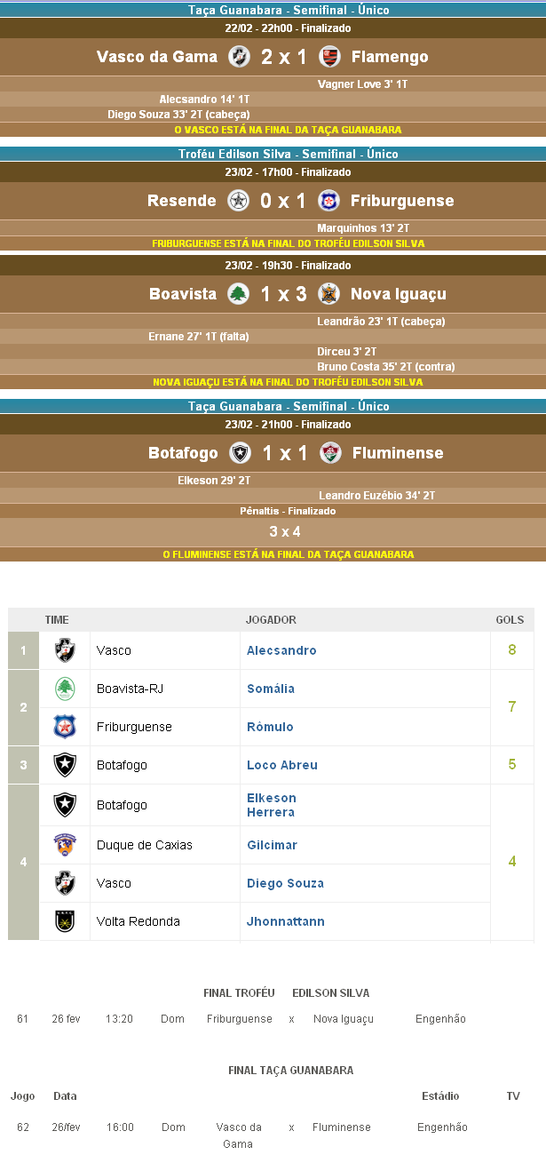 Terminada a fase semifinal da Taça Guanabara, que corresponde ao 1º turno do Campeonato Estadual, o Vasco, que derrotou o Flamengo por 2 a 1, manteve os 100% de aproveitamento na competição e avançou para a final da Taça GB, fase em que terá como adversário o Fluminense