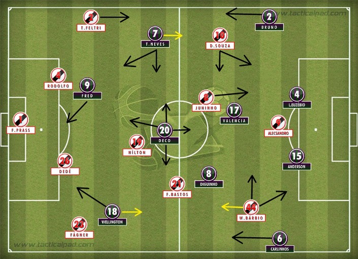 Exatos 75 minutos de amplo domínio, que só não virou goleada pelos gols feitos perdidos por Thiago Neves e Wellington Nem. Deco supreendeu Fernando Prass em belo chute e sobrou no meio-campo com passes perfeitos, visão de jogo privilegiada e a inteligência para ditar o ritmo da equipe.