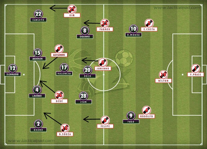 A execução do 4-2-3-1 beirou à perfeição. Wellington Nem atuou pela esquerda voltando com Fágner e aproveitando os espaços às costas do lateral vascaíno sem se intimidar com a cobertura de Dedé. Deco recuava para não deixar a saída de bola com os volantes Valencia e Diguinho e Thiago Neves à direita também voltava com Thiago Feltri, mas centralizava nas ações ofensivas, indefinindo a marcação de Nilton.