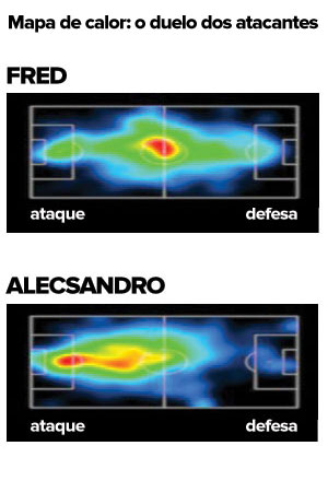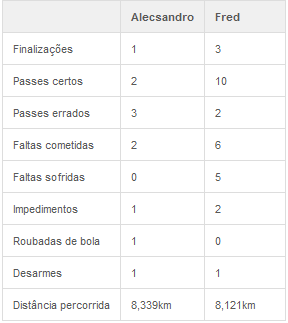 Fred também foi mais participativo. Deu 12 passes, sendo dez certos. Alecsandro deu menos da metade: cinco, acertando dois. O número de faltas cometidas e sofridas também mostra o tricolor encarando mais os embates com adversários. Ele cometeu seis e sofreu cinco. O rival fez duas faltas e sofreu uma. E não houve falta de empenho do vascaíno, que percorreu uma distância um pouco maior do que o tricolor (8,339km contra 8,121km).