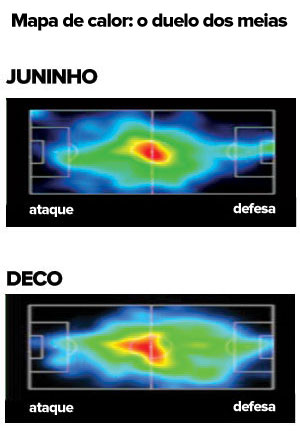 O mapa de calor demonstra que o local onde Juninho e Deco mais pisaram foi o meio do campo. Os dois, porém, não deixaram de ajudar a defesa e também de aparecer no ataque. O tricolor teve uma abrangência um pouco maior no campo defensivo, enquanto o Pernambucano procurou mais a faixa central ao longo da partida.