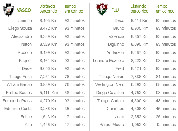 No quesito distância percorrida, destacaram-se também pelo Fluminense o lateral Bruno e os volantes Diguinho e Valencia. No lado do Vasco, Diego Souza e Alecsandro também estiveram no topo da lista. Confira abaixo os números de quem participou do clássico.