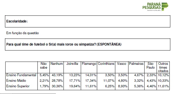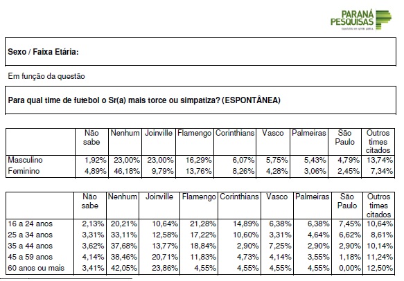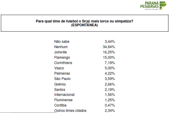 Quem acompanha o Blog Teoria dos Jogos está ciente de que o estado de Santa Catarina é um dos mais diversificados do país, no tocante ao perfil de seus torcedores. Trata-se de uma região onde praticamente nenhum clube desgarra, enquanto quase todos possuem boa representação – exceção feita aos grandes de Minas Gerais. Em outubro passado, o estado foi mapeado em termos gerais e de acordo com suas regiões. Agora, fruto da parceria do blog com o instituto Paraná Pesquisas, apresentamos com exclusividade os dados referentes à cidade de Joinville, no nordeste catarinense: