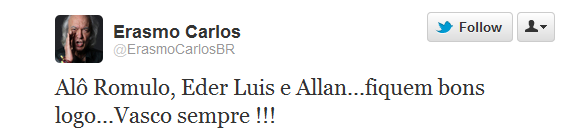 Via Twitter, Erasmo Carlos quer que Eder Luis, Romulo e Allan melhorem logo
